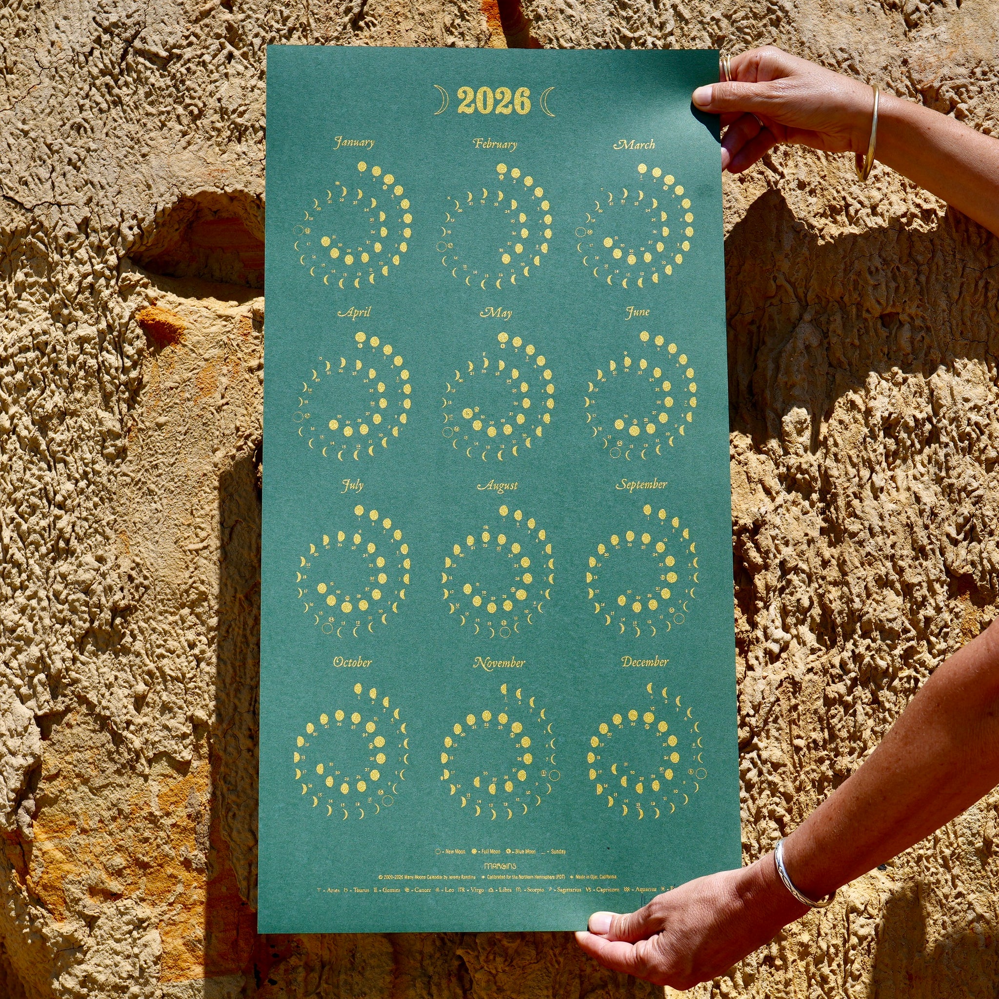 Hand silkscreened print in vibrant water based color with a texture you can feel. The unique spiral design shows each phase of the moon daily. Full and new moon transitions are highlighted, and zodiac symbols listed. Let the moon guide you!